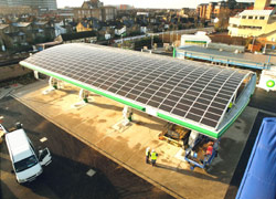 BP's solar plant in Madrid will produce photovoltaic cells, similar to those shown in the solar canopy, for Europe. (Credit: BP)