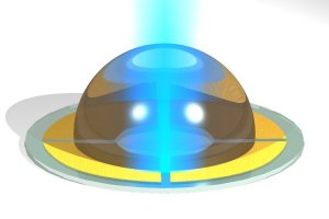 The control electrodes are shown in yellow in order to indicate their position with respect to the droplet. (Credit: Bell Labs, Lucent Technologies)