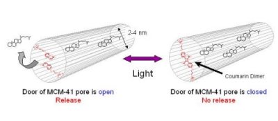 UV light light with a wavelength longer than 310 nm onto the silica closes the pores. Applying light with a wavelength of around 250 nm opens the "hinged double door". (Credit:AIST-Kansai)