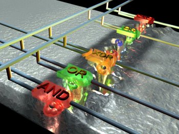 | Nanoclusters are located in a nanoscale break junction formed on a thin silver film. This junction is the conceptual 3D view of the data which appears in the PNAS paper. The darker areas surrounding the junction indicate silver oxide regions. Different clusters can be utilized as different optoelectronic logic gates. (Credit: Robert Dickson, Tae-Hee Lee) |