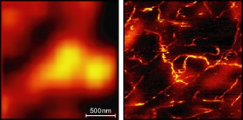 | This is a side by side comparison of the far field (ordinary microscopy) and near-field Raman images for the same 2 micron by 2 micron area dispersed with carbon nanotubes. In the first figure, a scale bar of 500 nm has been included. Both images are optical, where the signal intensity is integrated only over the Raman spectral lines. (Credit: Lukas Novotny and co-workers) |