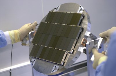 | e2v delivered the CCD chips to the French Commissariat à l'Energie Atomique (CEA). The CEA was responsible for building the MegaCam. This image shows a view of the 40 e2v sensors mounted on a precision plate prior to assembly by the CEA into their cryogenic camera. The array is cooled to a temperature of around - 120°C. (Picture courtesy of the CEA). |