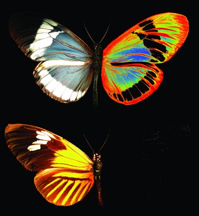 | A false color representation of polarization difference between two exposures with a 90 degree rotation of a polarization filter between exposures. Large polarization differences are coded in purple, and smaller polarization differences are coded in red, resulting in an image that only shows regions polarized light reflection from the wing. (Image Credit: Alison Sweeney) |