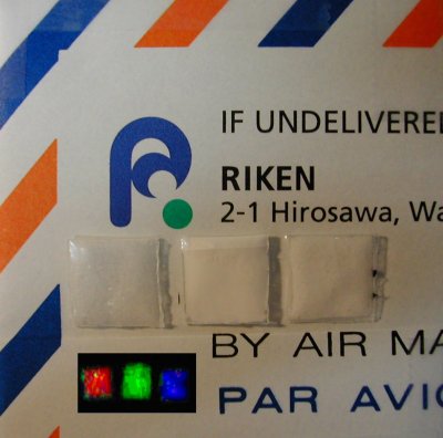 Inset:False-color image in which the red, green, and blue planes were assigned values proportional to the concentrations of MDMA, Aspirin, and methamphetamine, respectively. (Credit: Kodo Kawase)
