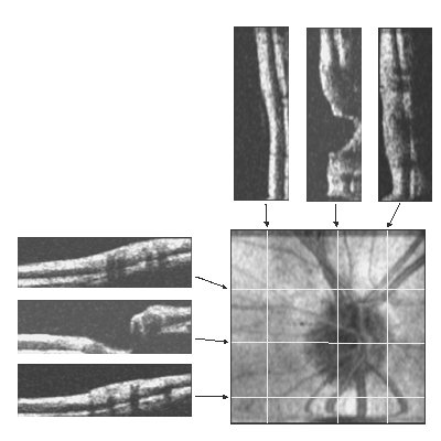 This shows a projection image of an optic nerve head and 6 cross sectional images derived from the 3D data set at the positions shown. (Credit: Christoph Hitzenberger)