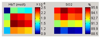 | A typical P-scan map. A mammogram-positive lesion might have higher risk to be a ductal carcinoma if the contrast-normalized standard deviation of HbT or SO2 is greater than 0.3, the relative HbT or SO2 average is greater than 1, or the relative standard deviation of HbT or SO2 is greater than 1. (Credit: Jimmy Mao, ViOptik) |