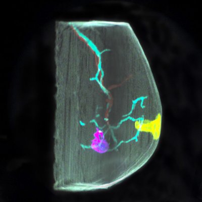 The Perspecta Medical can be used to pinpoint the location of tumors. This image shows the display's potential for locating tumors in the breast. (Credit: Actuality Systems)