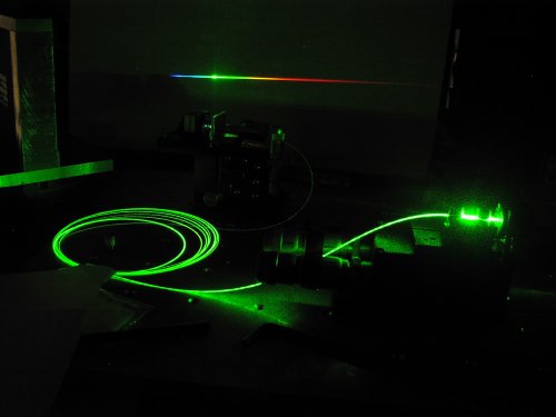 To generate the supercontinuum, the team couples both the fundamental (1064 nm) and second harmonic (532 nm) from a passively Q-switched Nd:YAG microchip laser into the fiber. (Credit: Pierre-Alain Champert, IRCOM)