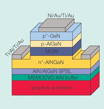 USC has developed 280 nm deep-UV LEDs which incorporate MEMOCVD-grown buffer layers, short-period superlattices (SPSLs) for strain management and other innovations. (Credit: University of South Carolina.)