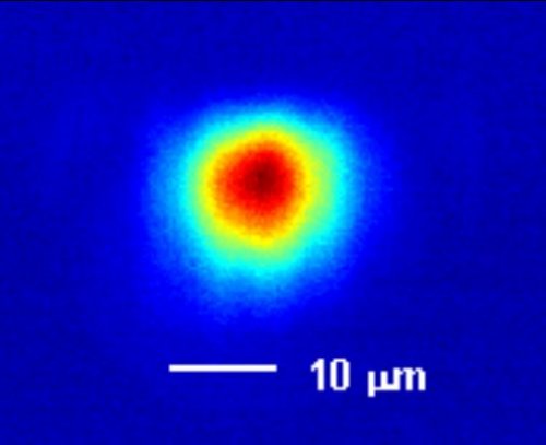 | Nearfield intensity mode profile for a silicon waveguide written using a femtosecond laser. Here, the ultrafast laser pulses were focused at a depth 130 microns below the silica-silicon interface. (Credit: Friedrich-Schiller-Universität, Germany, and University of Toronto, Canada) |