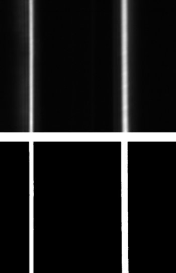 | The shadow of the fiber stem appears as a dark region with a bright band down the center (when working in two dimensions, two bands are seen on the camera). Using a threshold technique, the team converts the data from an 8-bit gray scale image (top) into a binary bright/dark format (bottom), suppressing the influence of any dirt or dust. (Credit: NIST, US) |