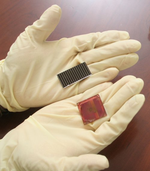 (top) A regular silicon solar cell and (bottom) UCLA's polymer-based photovoltaic. (Credit: UCLA, US)