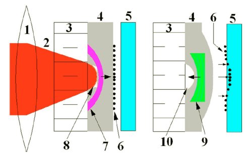 | Diagram showing laser ablation and foil/particle acceleration - 1: lens, 2: laser beam, 3: glass overlay, 4: foil, 5: target, 6: particles, 7: shock wave, 8: confined ablation, 9: expansion wave, 10: microcrater due to ablation. (Credit: Applied Physics Letters, American Institute of Physics) |