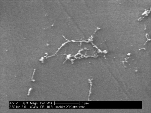 High resolution SEM image of snow on a sapphire target. (Credit: The Hebrew University, Israel)