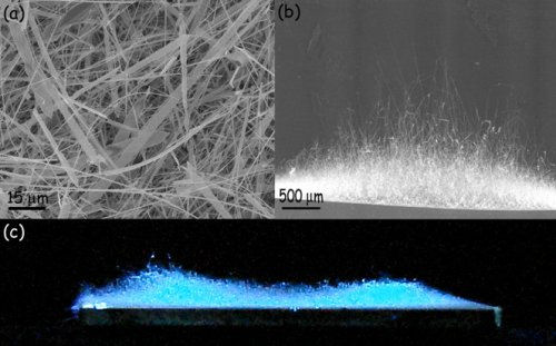 | In detail: (a) Field emission SEM image of the as-synthesized Ga2O3 nanobelts and nanowires grown on a silicon wafer. (b) side view. (c) optical image taken with a digital camera that shows the structure's strong blue emission when illuminated with 245 nm light from a handheld ultraviolet lamp. (Image credit: National Tsing Hua University) |