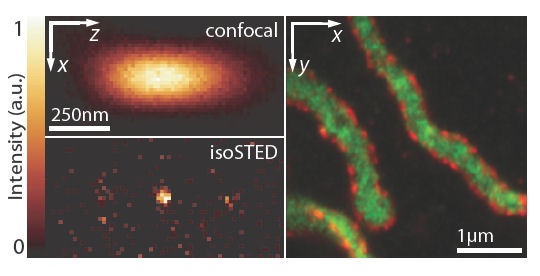 The picture (left) shows the 40-45 nm diameter focal fluorescent spot of the isoSTED microscope as compared to the focal fluorecsent spot of a (highest end) confocal microscope (shown are sections containing the optic axis). The fundamental reduction in size of the fluorescent spot enables a much higher spatial resolution in 3D. The picture (right) shows mitochondrion with nanoscale resolution. The TOM20 mitochondrial complex in red and a protein from the inner part of the mitochondrion in green. Image credit: Stefan Hell |