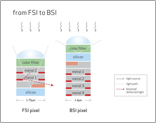 In the BSI approach, OmniVision's traditional CameraChip sensor is turned upside down so that it collects light through what was previously the backside of the sensor, the silicon substrate. This approach differs from conventional FSI image sensors, where the amount of light reaching the photosensitive area is limited by the multiple metal and dielectric layers required to enable the sensor to convert photons into electrons. Image Credit: OmniVision |