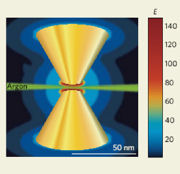 The researchers say that a bow-tie nanostructure of gold – measuring around 20 nm across – can enhance the intensity of femtosecond laser light pulses by two orders of magnitude. This is high enough to generate EUV light with a wavelength of less than 50 nm directly from a small pulse with an energy of 1011 W/cm2 injected into argon gas (Nature 453 757). The energy needed is about 100 times less than in traditional approaches.