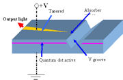 Zhang cites three factors as being crucial to this development. Firstly, a high density and highly inhomogeneous QD active region provides relatively high gain. Secondly, the combination of an unpumped absorber region and V-groove back facet effectively inhibits lasing and thirdly, the tapered waveguide structure prevents gain saturation effects at the output.