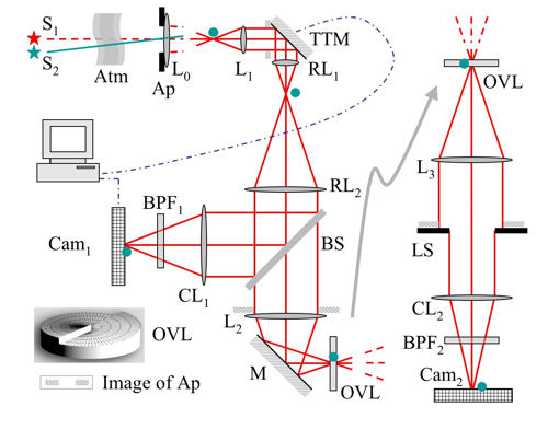 This is a schematic diagram of the optical vortex coronagraph. The primary star (S1) is focused on the axis of an optical vortex lens (OVL) whereas the secondary star (S2) is imaged at a separate point. Spatial filtering of S1 is achieved by placing an overfilled aperture i.e. a Lyot stop (LS), in the plane of the exit pupil of the system. Image Credit: Grover Swartzlander |