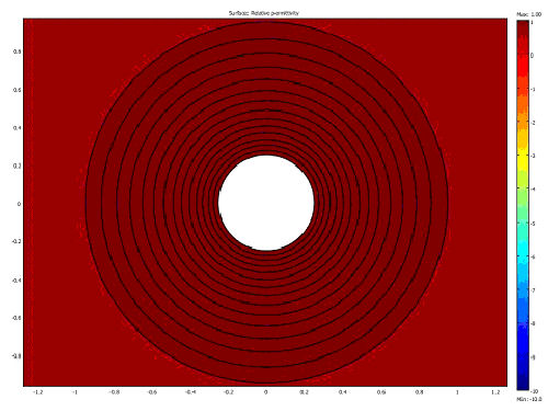 Numerical validation of the 2D cloaking design based on the variable diameter negative index rings. This image shows the refractive index distribution within the 2D cloaking structure.