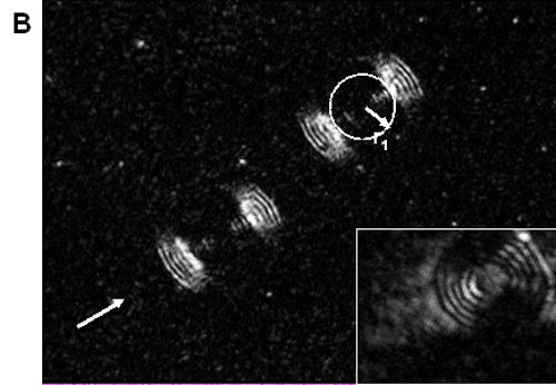 Optical image of surface plasmon-polariton propagation through two plasmonic reduced visibility devices at 532 nm. The area inside the circle of radius r1 is cloaked, except for a very small fraction of plasmon rays, which propagate exactly through the centre of the cloak. The illumination direction is shown by the arrow. The inset demonstrates plasmon scattering by a typical concentric ring structure, which is not optimized for cloaking at 532 nm. The plasmons are strongly scattered by the edge of the structure and by the circular area in the middle.