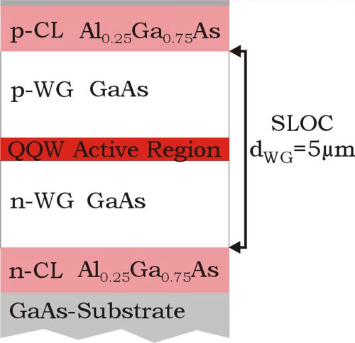 In the design, the thickness of the GaAs waveguide layers that surround the device's quantum well active region is increased. This results in 200 um stripe-width devices with an 8 mm long optical cavity. When mounted on C-mounts, these devices produced output powers of 38 W under quasi-CW operation from a single emitter. Image Credit: Agnieska Pietrzak |