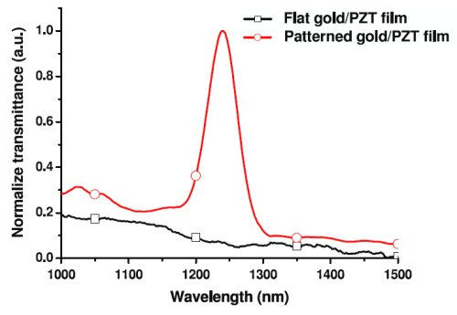 Transmission spectra of gold/PZT films before and after patterning.