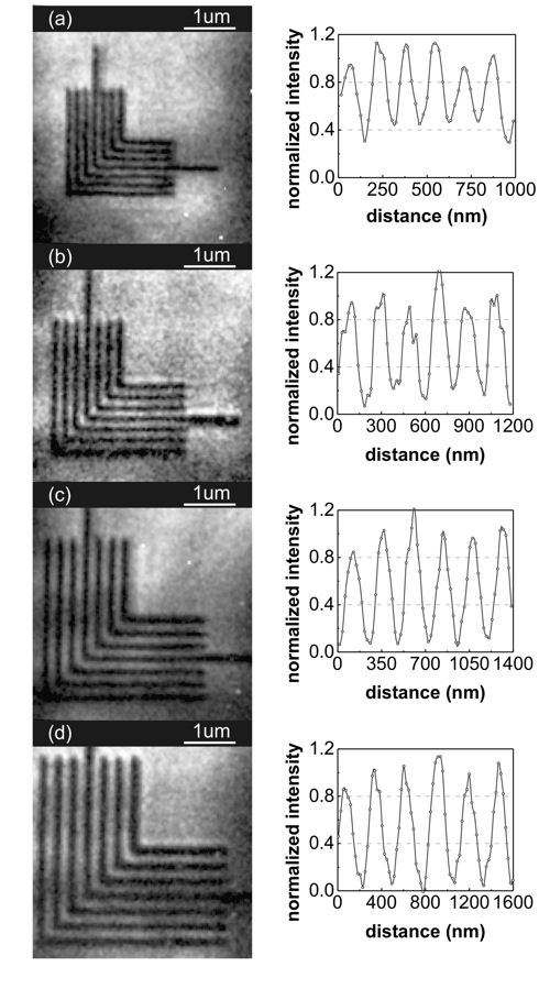 Fully resolved actinic images and intensity lineouts of elbow patterns with (a) 80, (b) 100, (c) 120, and (d) 140nm half-pitch. The images were obtained with 20s exposures and around 610x magnification. The intensity lineouts were obtained by averaging five rows of pixels (around 100nm on the mask) across the gratings. Image credit: Fernando Brizuela |