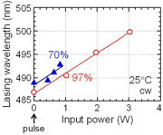 The output power of both types of laser are well ahead of the 5 mW measured from the longest-wavelength diodes grown on polar c-plane GaN substrates: 488 nm devices made by Nichia.