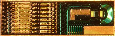| The 8-channel InP monolithic tunable optical router, or MOTOR, produced by University of California, Santa Barbara, scientists. The left half of the chip holds eight wavelength converter arrays, and the right holds the arrayed waveguide grating router. Credit: University of California, Santa Barbara. |