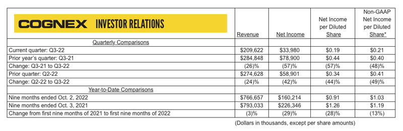 Camera and machine vision systems developer Cognex has reported its financial results for the third quarter of 2022. The table below shows selected financial data for Q3-22 compared with Q3-21 and Q2-22, and for the nine months of 2022 compared with the same period in 2021.