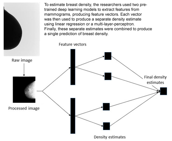 Using nearly 160,000 full-field digital mammogram images that were assigned density values on a visual analogue scale by experts (radiologists, advanced practitioner radiographers, and breast physicians) from 39,357 women, the researchers developed a procedure for estimating the density score for each mammogram image. The objective was to take in a mammogram image as input and churn out a density score as output.