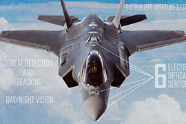 Distributed Aperture System collects high-resolution imagery to pilot's HUD from six IR cameras around aircraft.