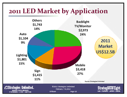 The worldwide high-brightness LED market grew from $11.3 billion in 2010 to $12.5 billion in 2011, a growth rate of 9.8%, according to LED market analyst Strategies Unlimited. Demand for LED components in the lighting market grew 44%, from $1.2 billion to $1.8 billion.On the supply side, 10 companies accounted for almost 70% of the LED market. Strategies Unlimited arrived at these figures after analyzing market demand as well as the supply-side activity of more than 54 major LED component suppliers.