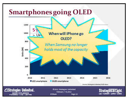 MobileThis segment stayed flat, at $3.4 billion. The overall decrease in the mobile phones market was offset by a sharp rise in tablet display and flash applications. A major development in this segment is the move to OLED displays. Approximately 50% of smartphone displays are expected to be OLEDs by 2016.