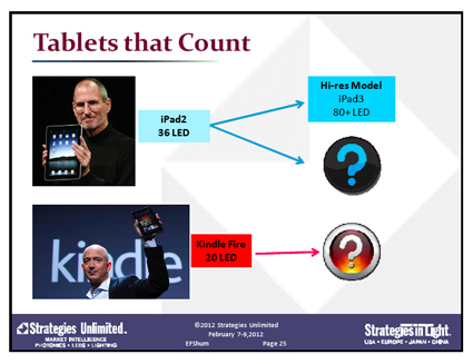 Philips Lumileds, Cree, and Osram Opto Semiconductors' expansion into 6-inch substrates slowed as there was a great deal of excess capacity in their existing 4-inch lines. The Japanese LED business has trended down or flat. However, Nichia and TG are major beneficiaries of the boom in tablet computers. Osram OS gained a major design win, which propelled its visible LED component business to more than $1 billion.