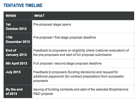 The BiophotonicsPlus European Competition for Collaborative R&D Funding will commence on 1 October 2012 with the launch of the transnational call for project proposals. Detailed information will be available on this website from that date on; there is already much background information and terms available for interested parties.