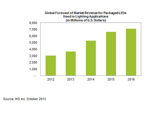 | General lighting has long been seen as prompting the "third wave" of the LED revolution, preceded by the mass-market backlighting of first cell phones and then notebook PCs and televisions. IHS believes that as the cost of LED lamps drops, widespread consumer adoption will drive the market for packaged LEDs used in lighting to some $7.1 billion in 2016. Source: IHS. |