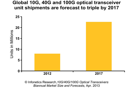 Market research firm Infonetics Research has released excerpts from its report on likely demand for and recent sales of 10G/40G/100G optical transceivers.The full report details market size and forecasts sales of multi-gigabit optical transceivers into the optical transport, enterprise, data center, broadband access, and carrier routing and switching markets.