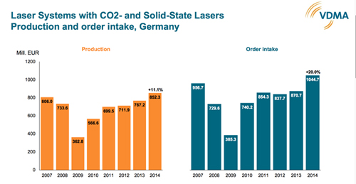 The VDMA commented, “The global consolidation of production volume yields a performance level that is considerably more meaningful, namely €668 million or about a third greater than the result in Germany itself, as well as a 5% rate of increase. These records comprise CO2 lasers, solid-state lasers and diode lasers for direct application.