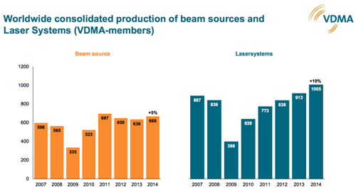 Annual production of laser-based manufacturing systems made by companies at German locations for the first time exceed the billion euro mark, according to data compiled by the German Engineering Federation (VDMA), Laser and Laser Systems division.In 2014, VDMA member companies produced about €852m of laser-based machines, corresponding to an 11% growth over 2013 . Global consolidation – the output following allowances for the added value created by international players – records €1.01bn, representing 10% growth over 2013. Furthermore, growth was considerably greater for systems equipped with solid-state lasers rather than older technologies.