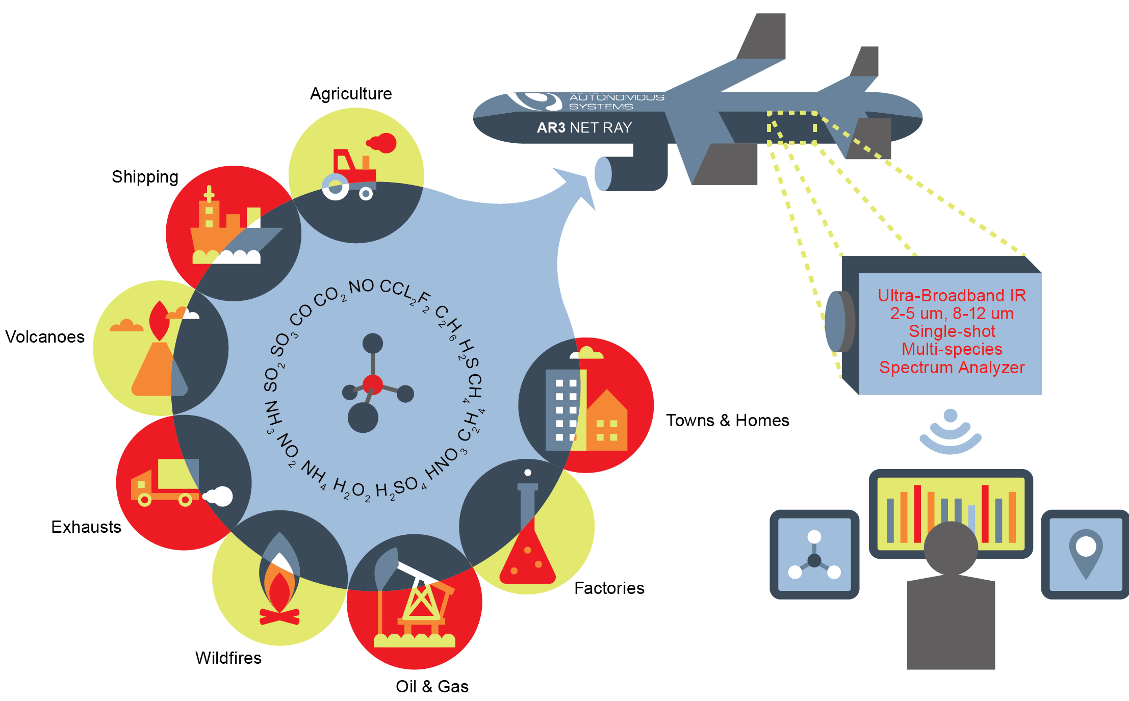 New approachStandard gas sensors on ground-based stations usually deploy light detection and ranging (LIDAR) or differential optical absorption spectroscopy (DOAS), focusing on one or few specific molecules, such as carbon dioxide and methane, using a narrow spectrum laser.