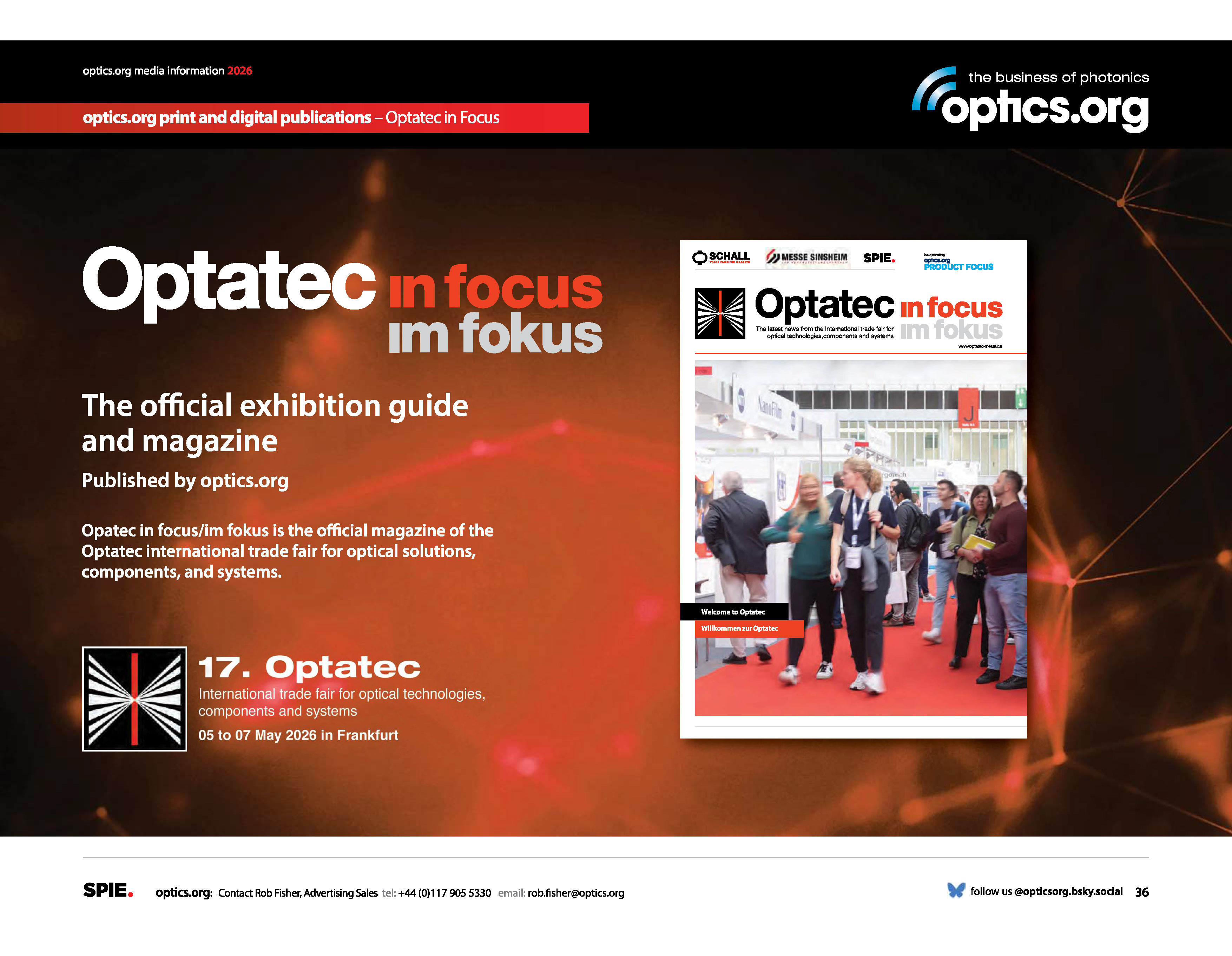 The combination of highly respected editorial from optics.org and targeted distribution to the attendees of Europe’s largest optical fabrication show makes Optatec In Focus an essential marketing resource that delivers targeted marketing to 1000s of industry professionals.