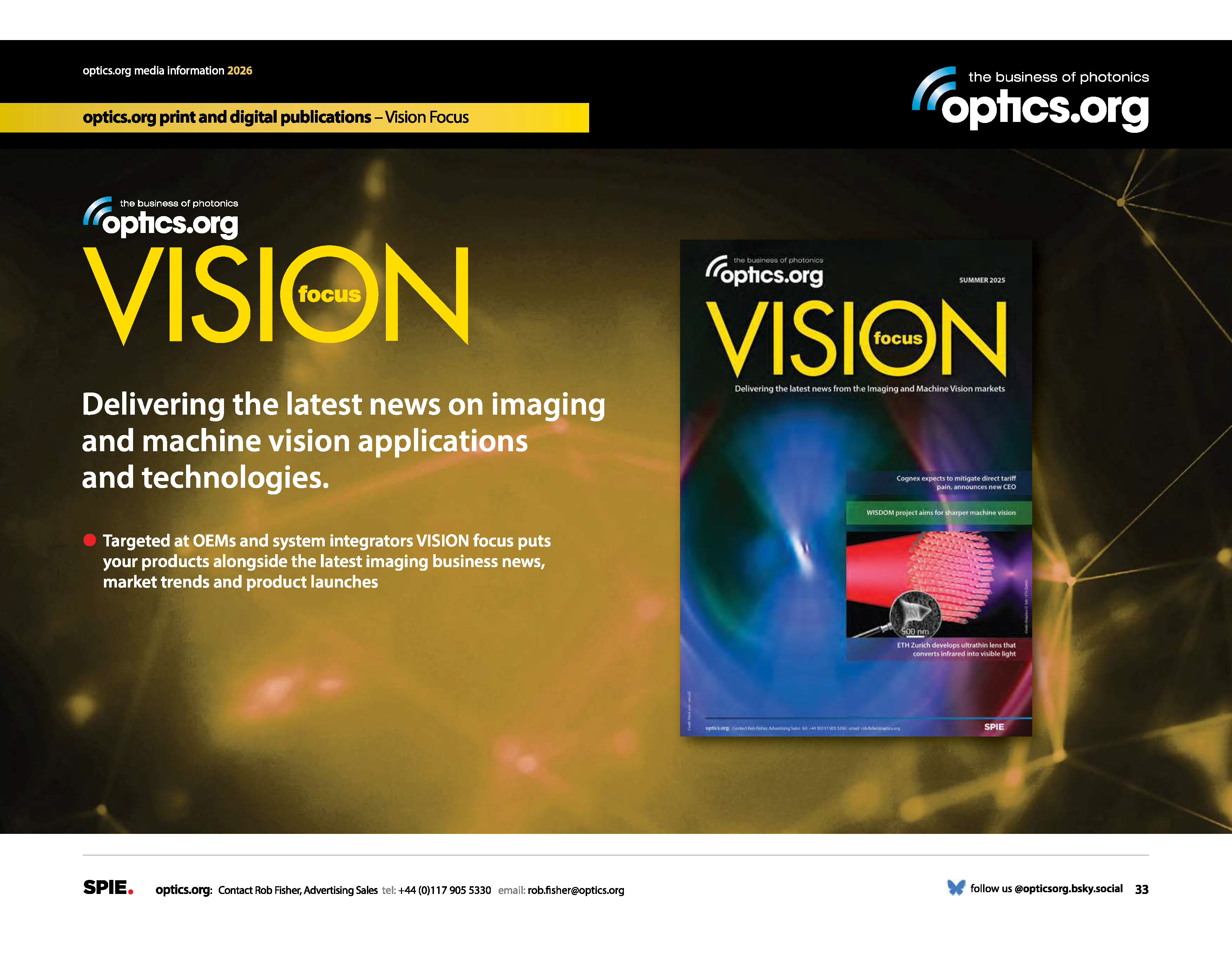 The next edition of VISION Focus will be published in April and will focus on defense, security and surveillance applications and sensor technology. VISION Focus will also be distributed at the SPIE Defense+Commercial Sensing conference and exhibition.